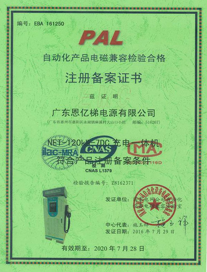 自動化產品電磁兼容檢驗合格注冊備案證書(充電一體機)